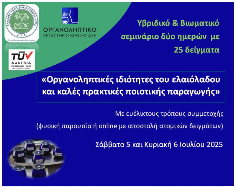 30 Μαρ Μη κατηγοριοποιημένο Υβριδικό σεμινάριο 25 δειγμάτων για τα Οργανοληπτικά χαρακτηριστικά του Ελαιόλαδου και τις καλές πρακτικές ποιοτικής παραγωγής Posted by Radamanthys Androulakis 1 Σεπτεμβρίου 2025 Continue reading